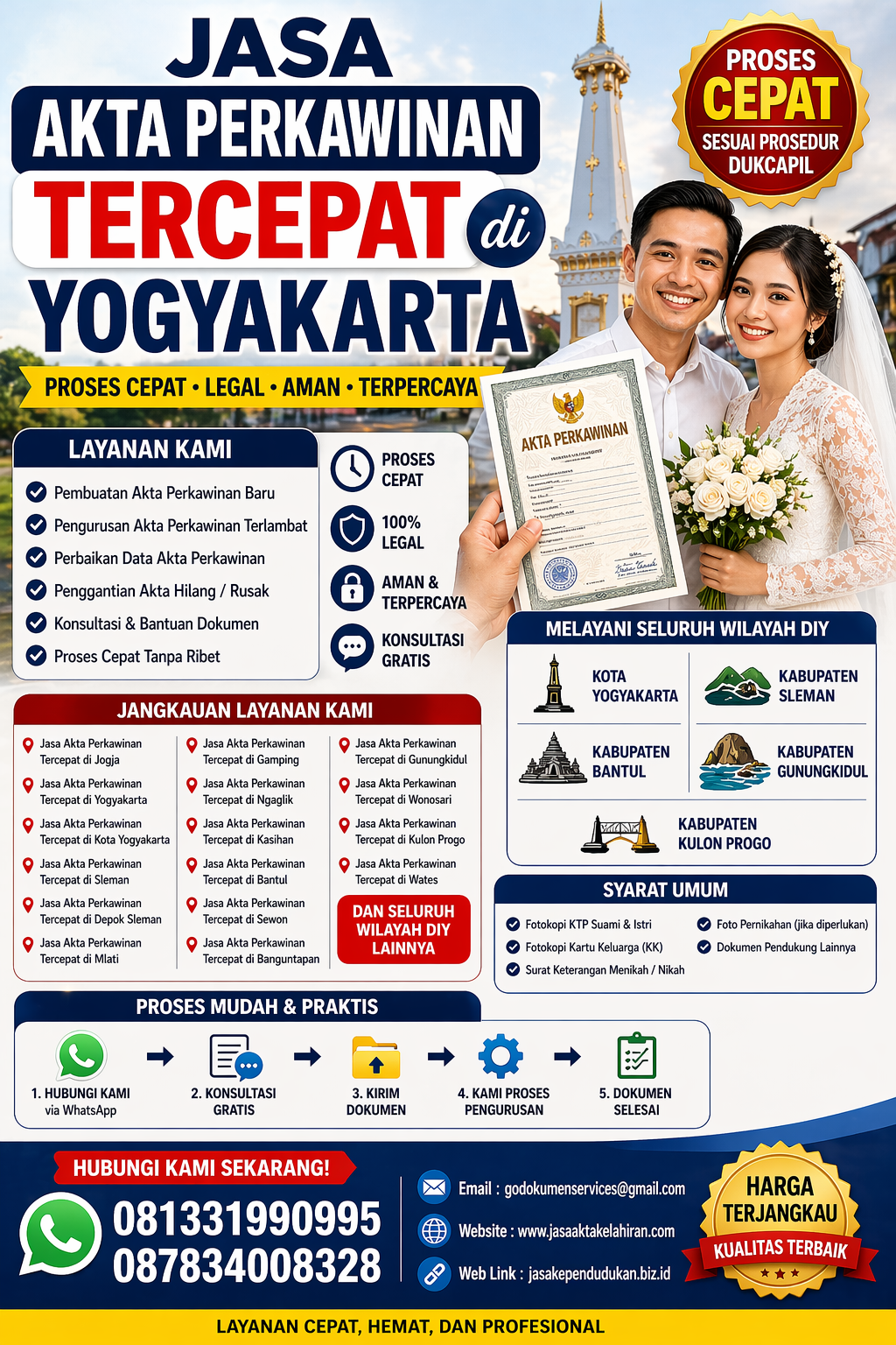 Jasa Akta Perkawinan Tercepat di Yogyakarta adalah layanan profesional untuk membantu pembuatan, perbaikan, dan pengurusan akta perkawinan secara legal, cepat, aman, dan terpercaya di seluruh wilayah DIY.